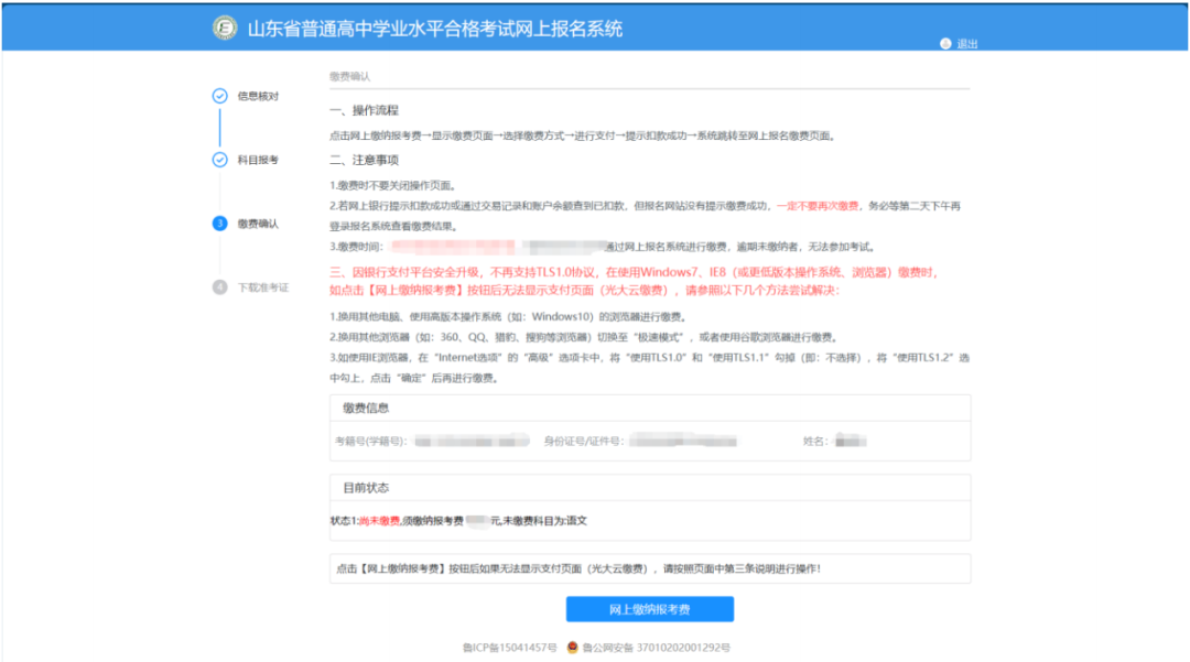 选择报名科目,点击【提交缴费】按钮后进入缴费确认页面,如下图所示:
