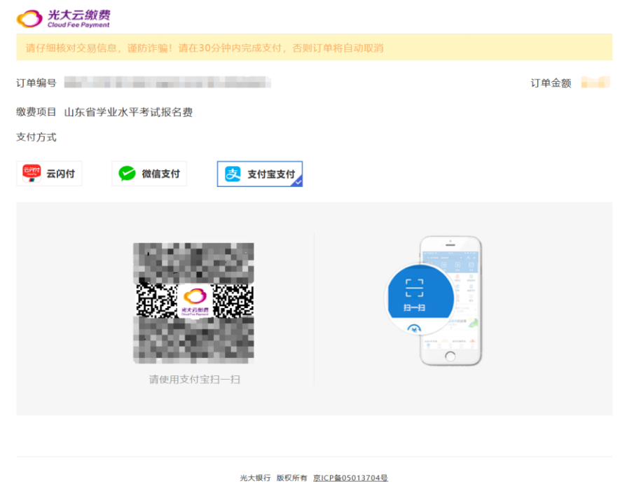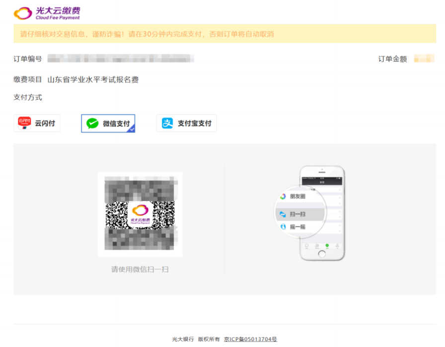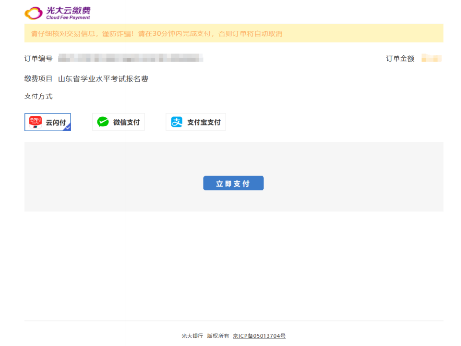 点击【网上缴纳报考费】按钮后,将针对选考科目进行缴费,系统会显示光大银行缴费页面,选择‘云闪付’,如下图所示: