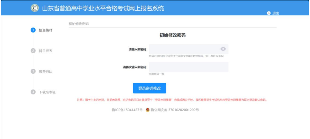 新密码必须由8至16位的大小写英文字母和数字组成,如:ABC123abc,字母区分大小写,正确输入新密码和再次输入新密码后,点击【登录密码修改】按钮密码修改成功。