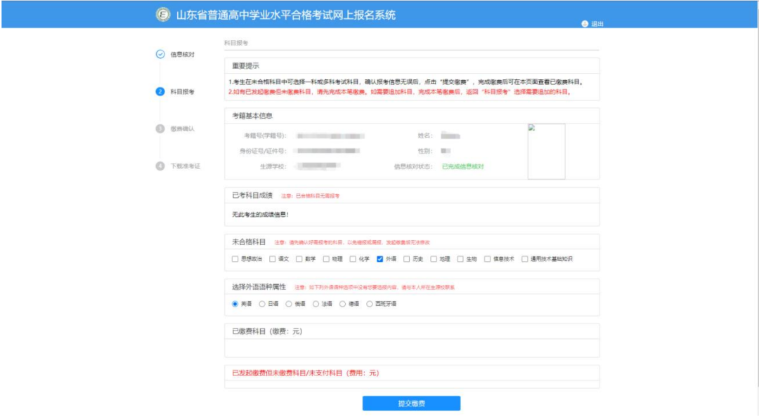 考生信息核对后,进入科目报考流程页面,只有未合格科目选择外语科目时才能选择外语语种属性,选择要报考的科目,点击【提交缴费】,如下图所示: