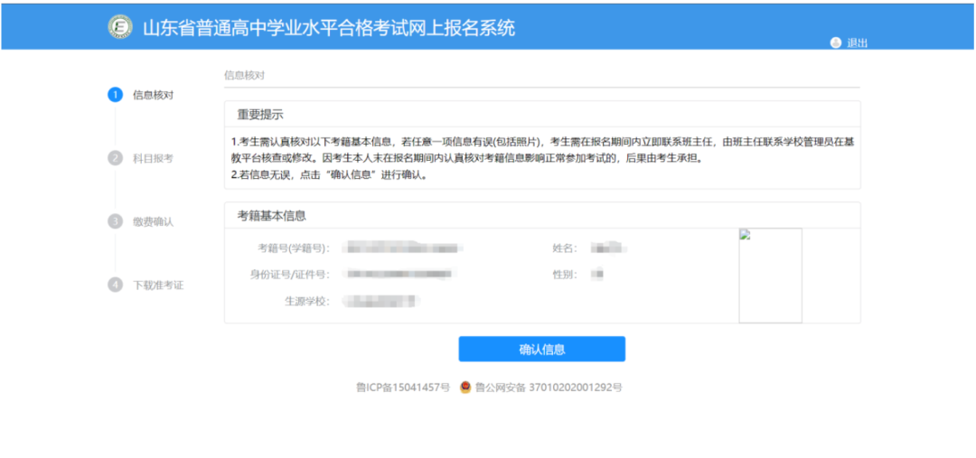 考生在信息核对阶段成功登录系统后,进入信息核对页面,核对基本信息,如下图所示: