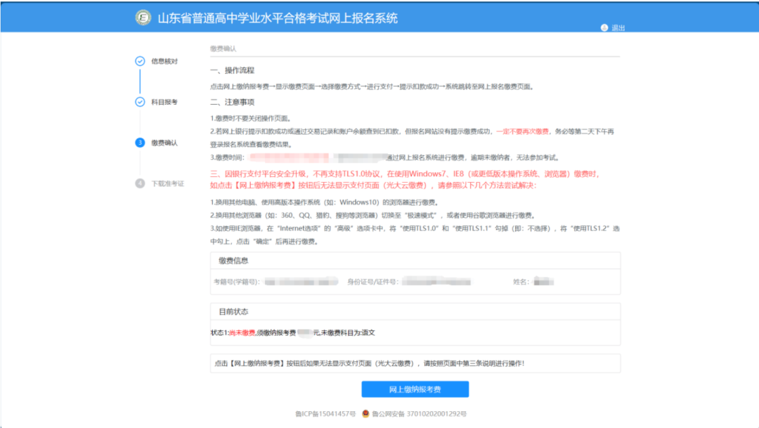 考生须于10月30日—11月6日(每天9:00—17:00)登录报名系统(https://xysp.sdzk.cn),进 行信息核对,信息核对无误后直接进行网上选科缴费。缴费成功方视为报名完成,否则 视为未报名成功,不能参加本次考试。