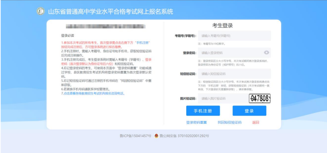 返回系统登录页面, 在系统登录页面输入考籍号(学籍号)、登录密码(首次登录默认为身份证号 (或护照号)后六位)、短信验证码(注册手机号时获取)、图片验证码,点击【登录】按钮, 即可登录系统,如下图所示: