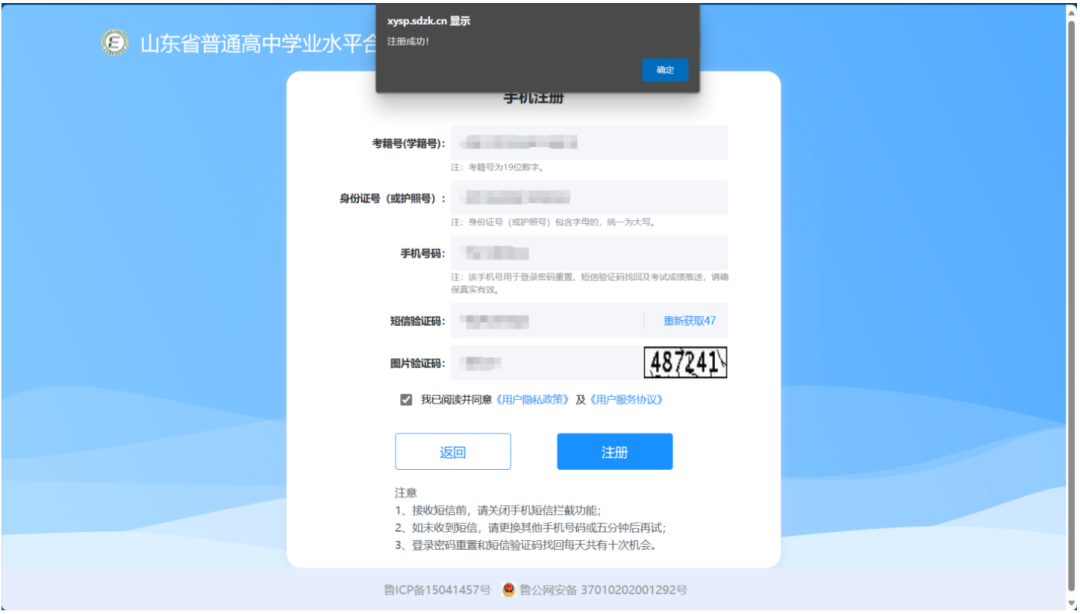 首次登录报名系统需要注册手机号获取登录用的短信验证码。点击系统登录页面的【手机注册】按钮后进入手机注册页面(如下图所示), 依次输入考籍号(学籍号)、身份证号(或护照号)、注册的手机号码, 图片验证码,点击【获取短信验证码】按钮, 会接收到短信验证码(该验证码在当次报名考试期间一直有效,请妥善保管) ,输入短信验证码、图片验证码后,点击【注册】按钮进行注册。