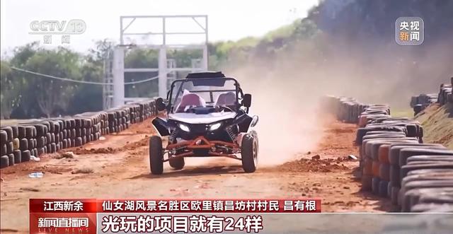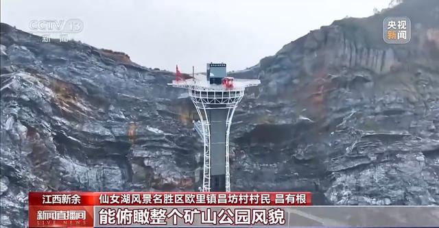 昌有根:以前我们在这里挖矿,我站的地方,矿下面有二三十米,我记得原来,山上光秃秃的看不到一点绿,运矿车一趟趟开过,尘土能飘到几里外的林子里,窗户都不敢开。2022年咱们仙女湖风景区开始修复这片废弃矿山,把原先光秃秃的石灰石矿坑,改成了现在漂亮的景区,光玩的项目就有24样,想都不敢想,当年我们挖矿的石头山能变成这么受欢迎的好地方。