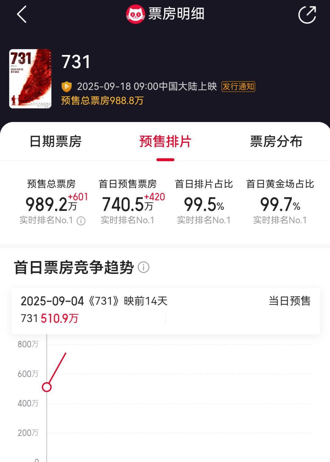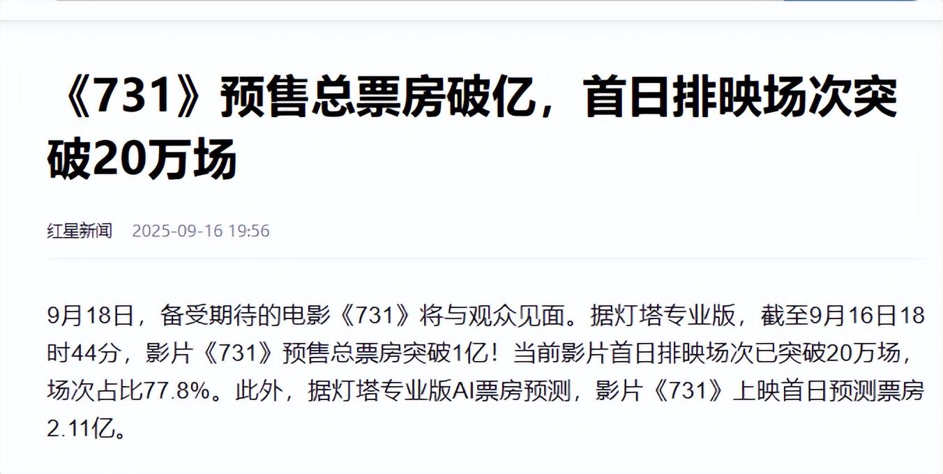 红星新闻 2025-9-16 《731》预售总票房破亿,首日排映场次突破20万场