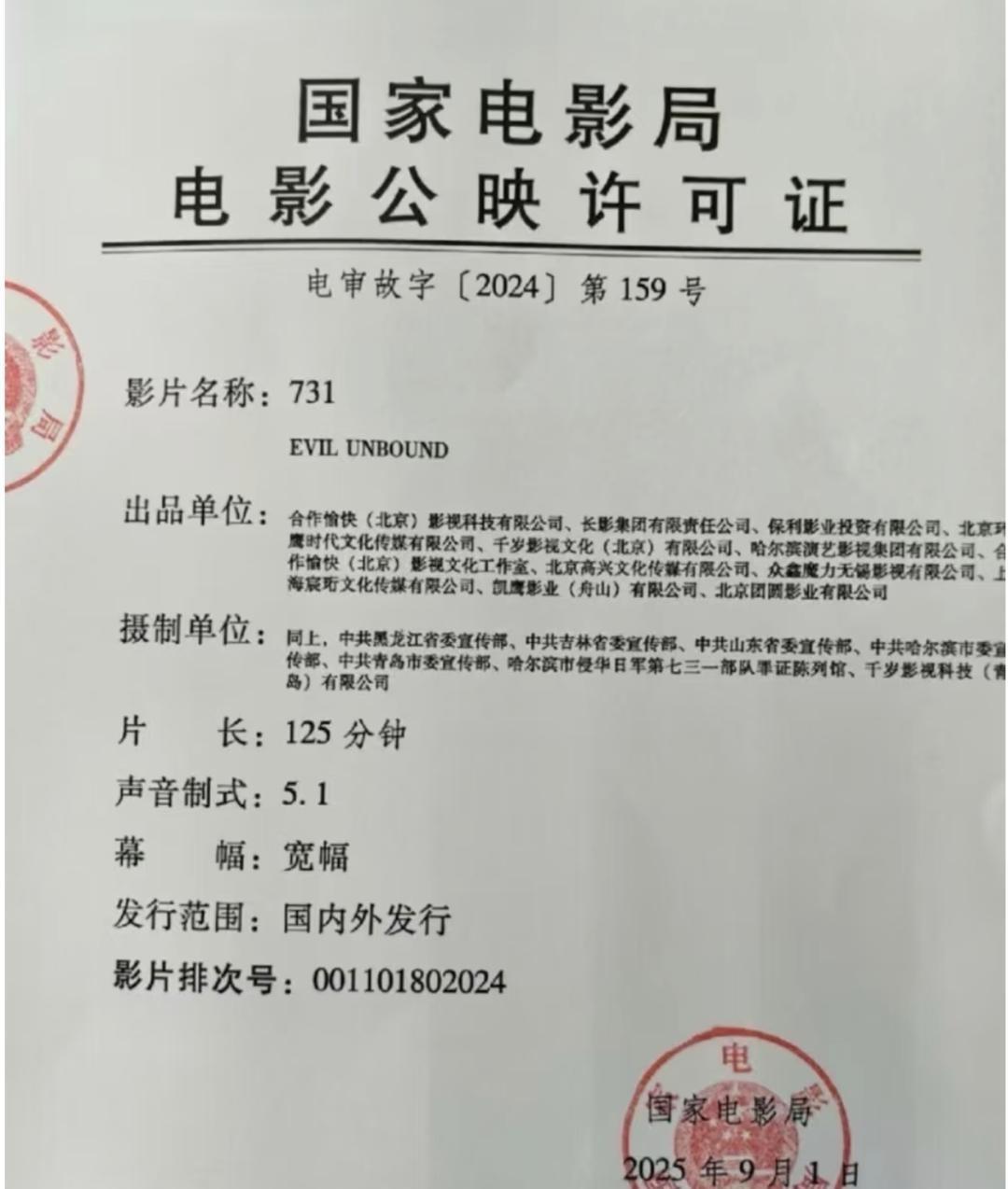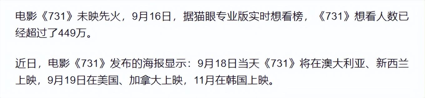9月18日上午9点,《731》将开启全球首映。