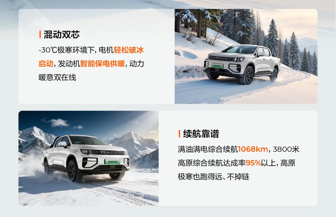 吉利雷达作为连续三年稳居中国新能源皮卡市占率第一的品牌,此次推出的两款场景化车型,是一次精准的市场切割。在传统燃油皮卡凭借“耐造”形象牢牢占据专业工具车及极端环境市场的背景下,雷达通过电混技术解决了纯电车型在严寒、高原的续航与动力焦虑,并以“精准场景调校”直面用户痛点。