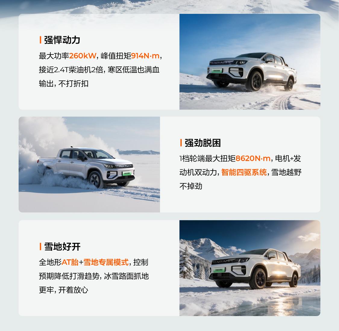 雷达地平线PHEV高寒版与金刚PHEV山地版的上市,不仅填补了新能源皮卡在细分场景下的市场空白,更以极具竞争力的价格,对同价位燃油皮卡形成了“性能降维”冲击。这标志着新能源皮卡已从城市商用、生活玩乐场景,正式向全天候、全地域的专业应用领域纵深拓展,有望改写高端工具型皮卡市场的竞争格局。