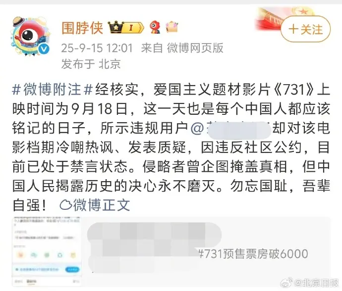 简单点说就是:有人对《731》这部电影发表不当言论、发表不当评论,然后被微博给禁言了。